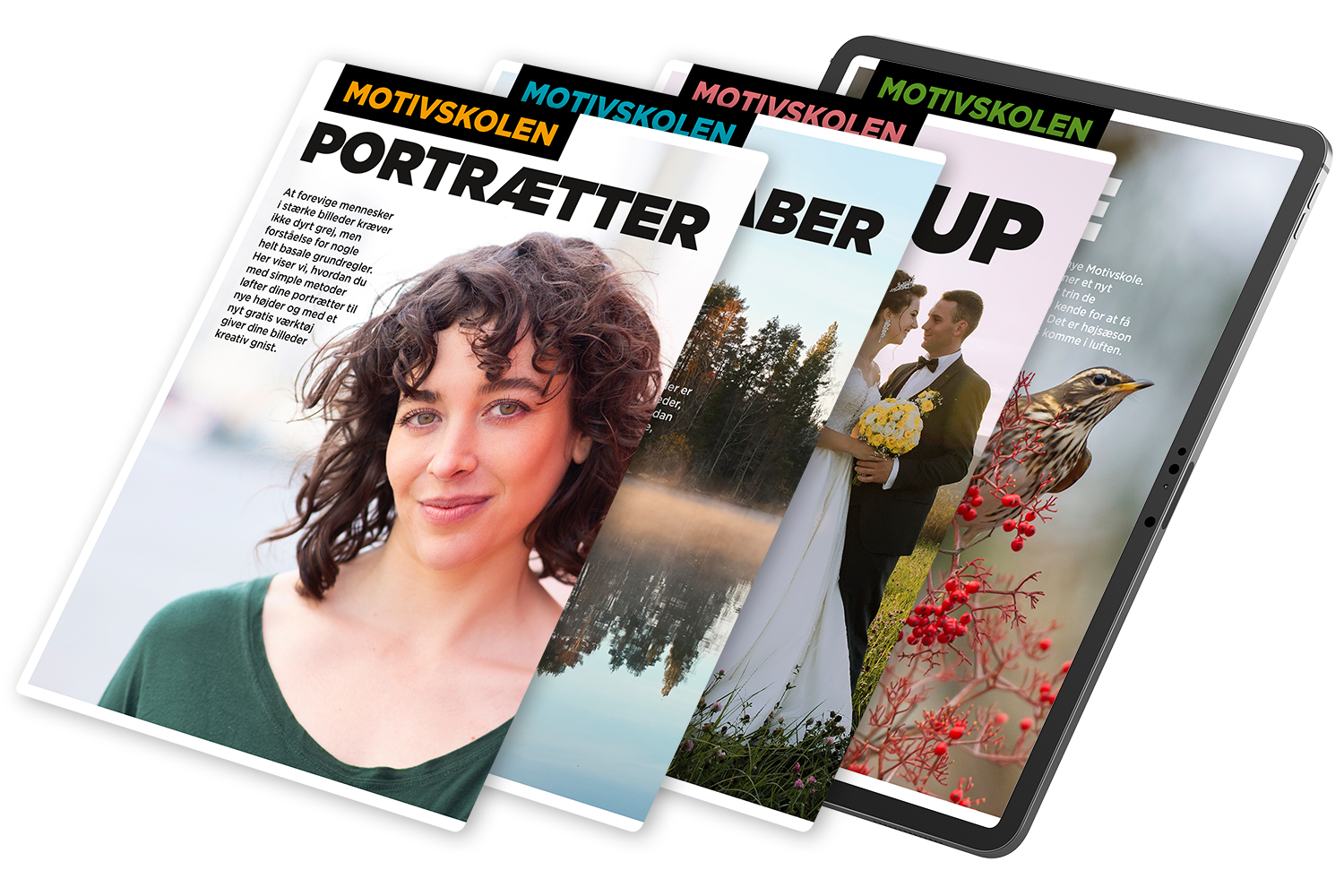 Fotografering Motivskolen: Start din samling nu Nu kan du hente de første fire afsnit af vores serie “Motivskolen", hvor du lærer alt det grundlæggende for at tage billeder af alle de store motiver. Hvert afsnit er en lille e-bog, som du kan gemme på digitale enheder og tage med dig.