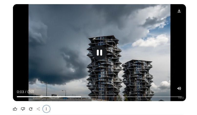 Vi fandt et motiv fra storbyen, hvor skyerne var på vej indover et højhus. Ved at bede Gemini om at lave en videoer ud af billedet, hvor skyerne bevægede sig, blev bevægelsen fuldendt.