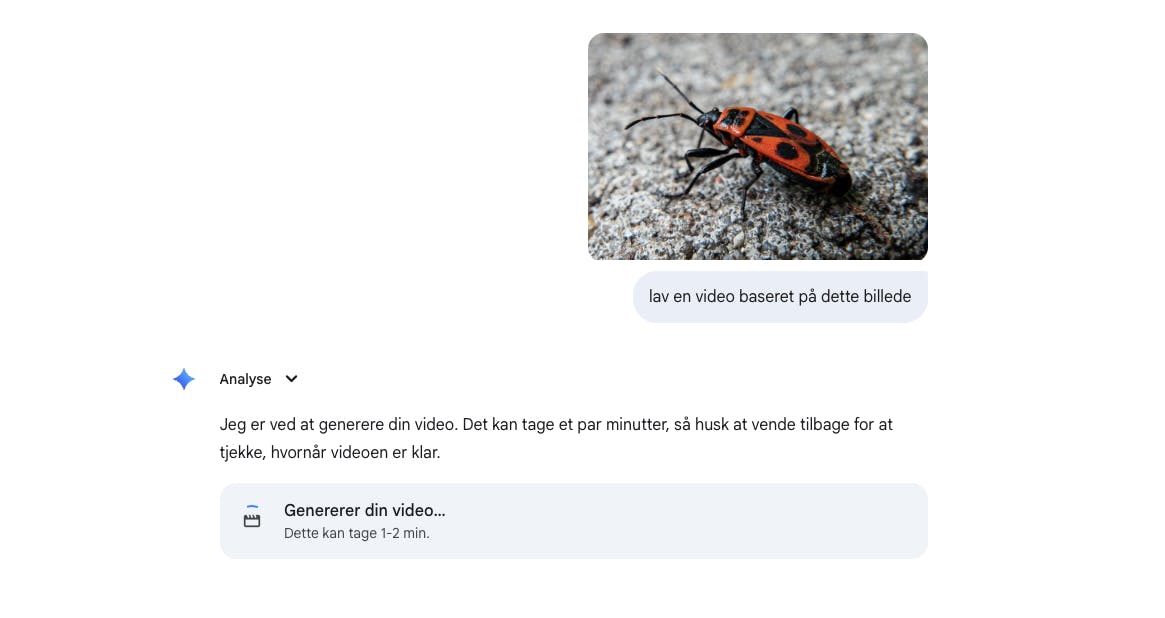 Du give Gemini frie rammer og skrive fx "lav en video ud fra dette billede". Så får du et ret realistisk resultat. Vi uploadede et makrobillede af et insekt. Det kom til live og gik fremad på meget overbevisende manér, om end et af dets ben pludselig forsvandt. Funktionen er stadig ret ny, så vi tilgiver en lille smutter som den. Den slags er nok ret hurtigt udraderet.