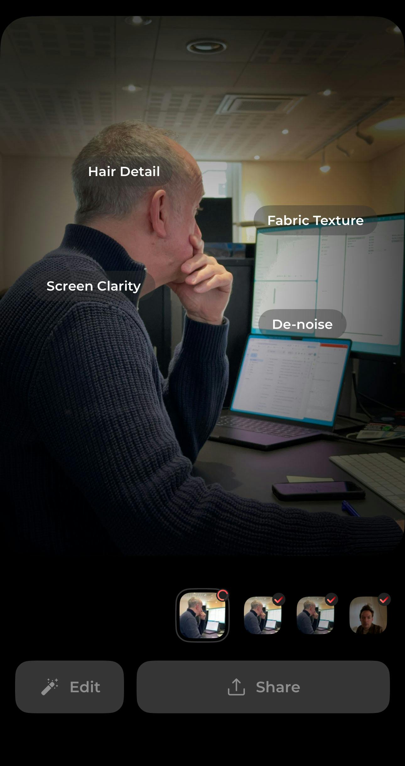 Processen kan tage op til et halvt minut og undervejs fortæller appen hvad den gør for at optimere billedet. Vi fik resultater, hvor kun lyset var tilpasset en smule og resultater hvor lyssætning og farver var ændret radikalt, hvor objekter var fjernet eller modificeret, og hvor ansigter var retoucheret og diskret justeret.