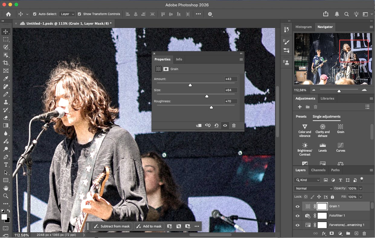Her kan du justere kontrast i mellemtonerne for at tilføre større definition samt kontrollere graden af tåge og anden sløring, der gør billedet fladt. Der er også et justeringslag til Grain, som giver mulighed for at tilføje korn, for at give billedet et mere råt og analogt udtryk.