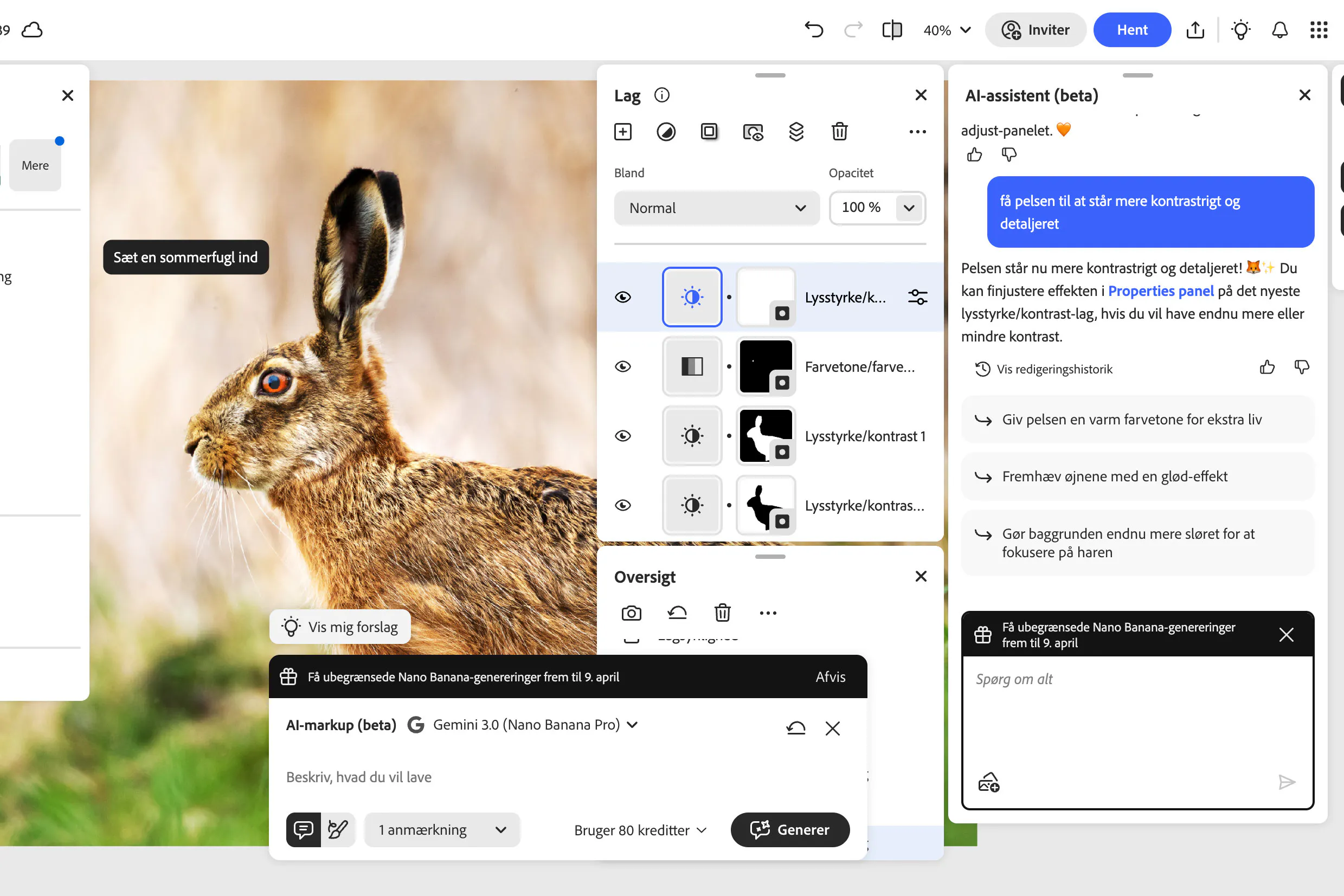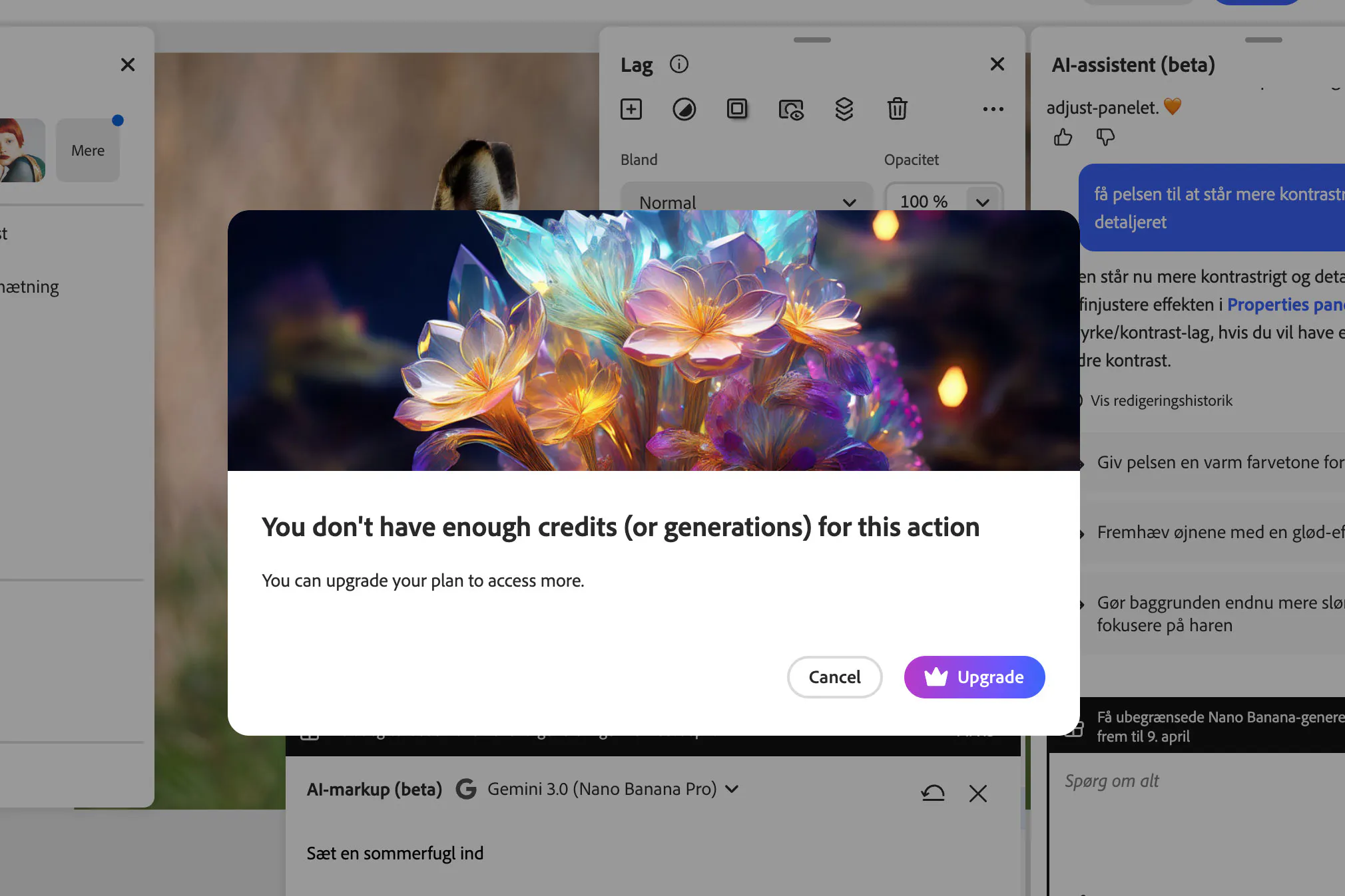 Vi markerede et område og bad assistenten sætte en sommerfugl ind, men fik at vide, at vi ikke havde nok credits til at udføre denne handling, selvom der på vores konto var flere tusinde credits til både almindelige og Premium-genereringer. Adobe lover desuden, at alle brugere får gratis genereringer med Nano Banana frem til den 9. april, så det tyder på en fejl i systemet. Det kan dog tilgives, da der trods alt er tale om en beta.