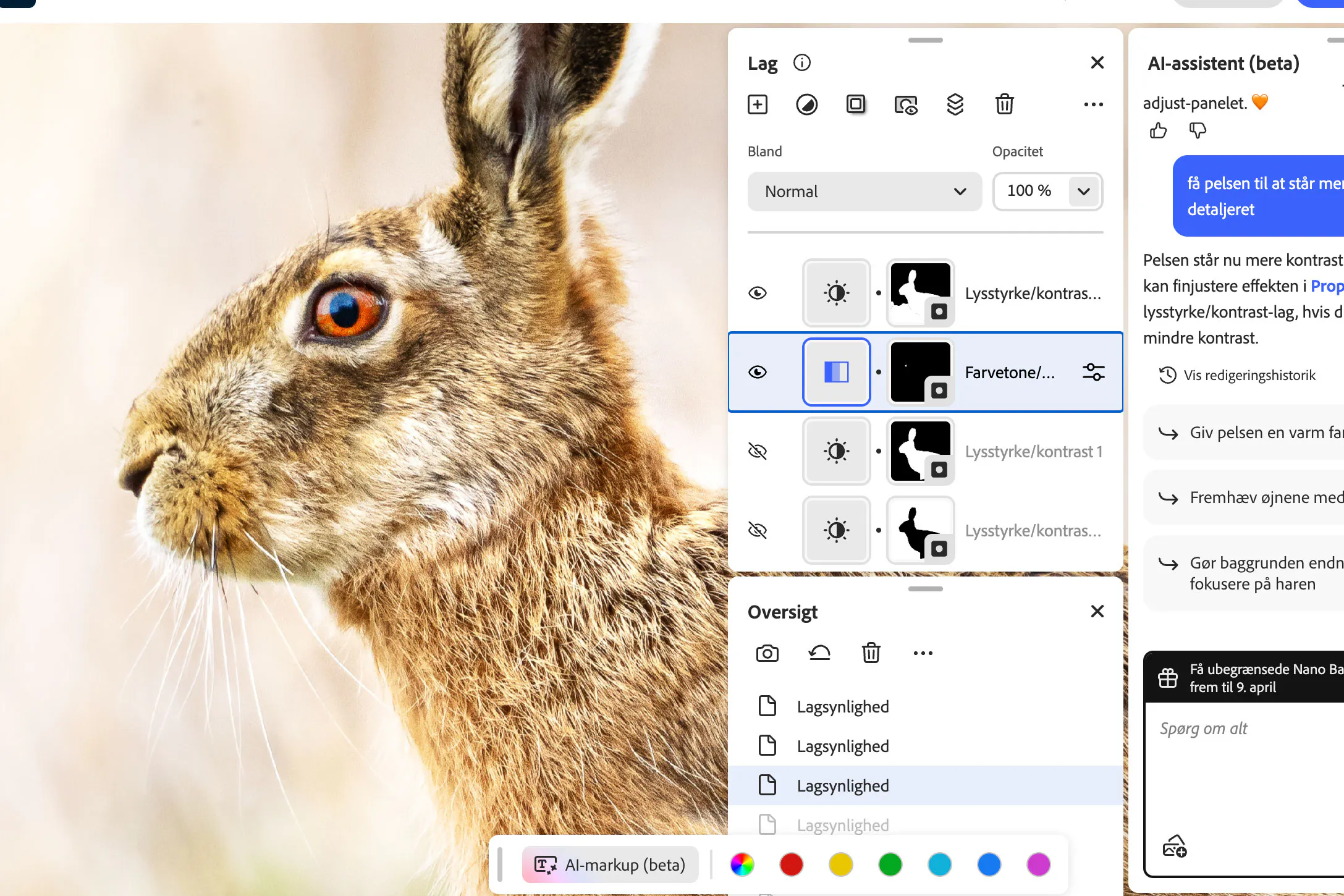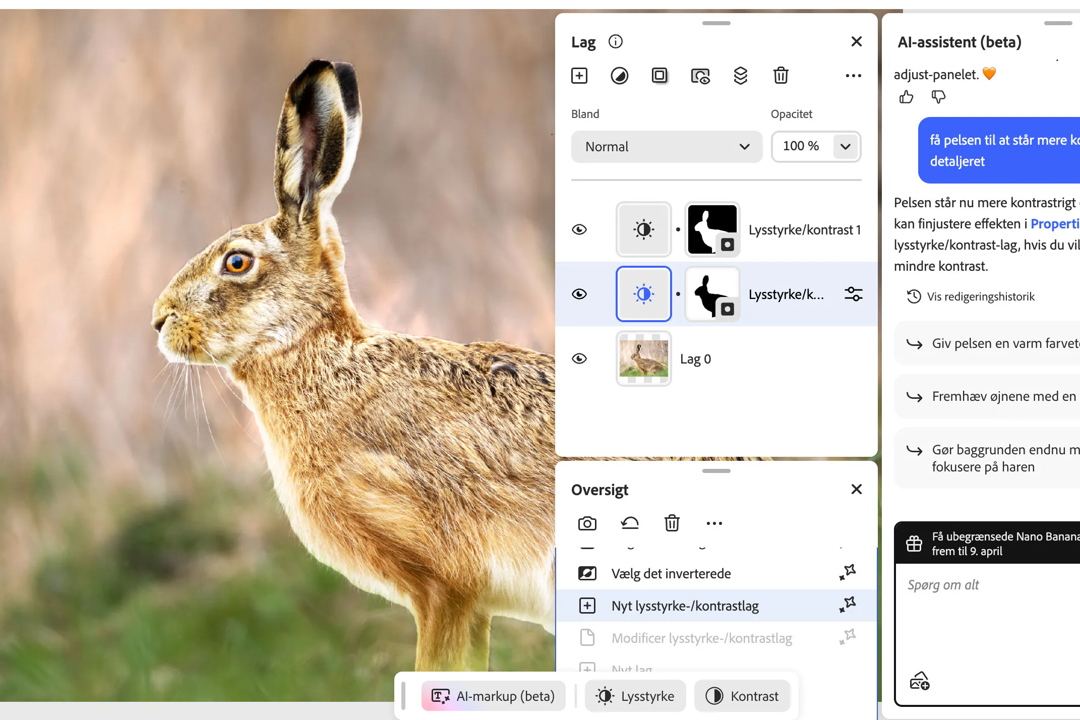 Da vi bad AI-assistenten om at styrke definitionen i harens pels, var resultatet heller ikke helt i skabet. Farvetonen fik en sær glød og en svag kontrast. Det kunne vi dog selv rette til med de tilgængelige skydeknapper.