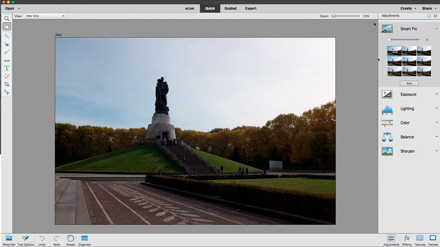 Et af Elements' hurtigste værktøjer er Smart Fix. Her kan du åbne dit billede og få programmets i alt ni forskellige bud på tilpasning af billedets lys og kontrast. Du kan også finpudse resultatet i Smart Fix.