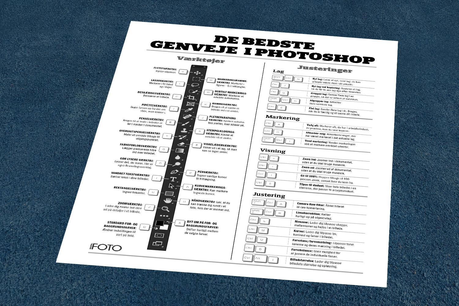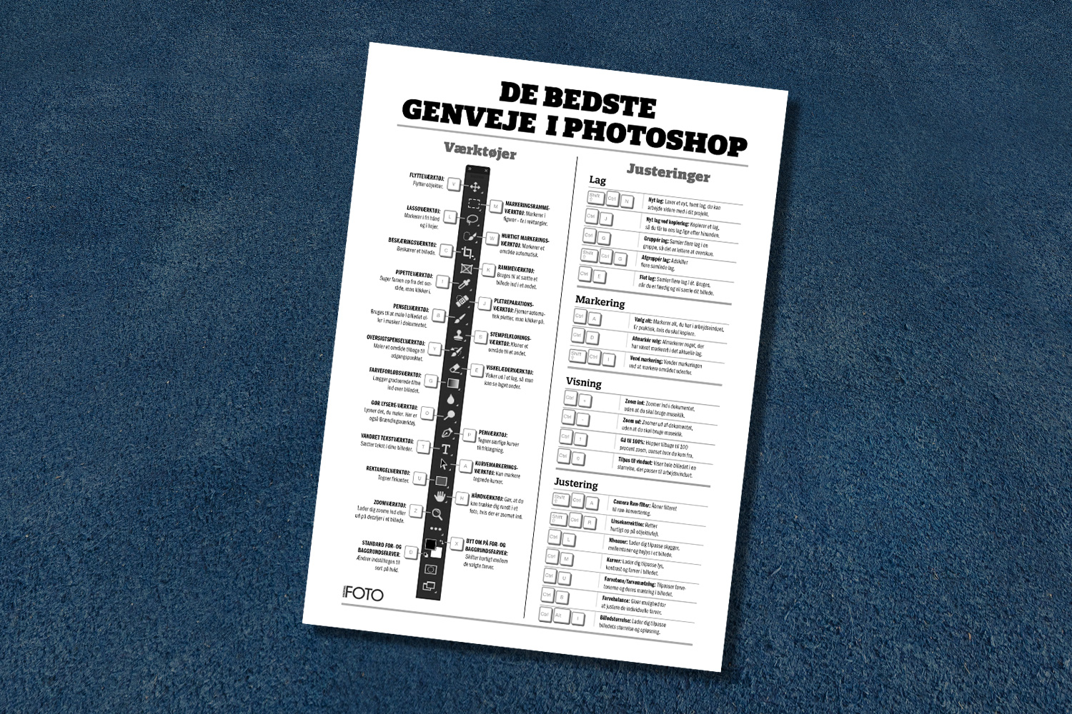 Her har vi lavet en oversigt over de vigtigste og bedste tastaturgenveje i Photoshop. Du kan gemme oversigten på computeren, og du kan printe den, så den kan ligge ved siden af computeren, så du nemt kan lære dine favoritgenveje at kende.