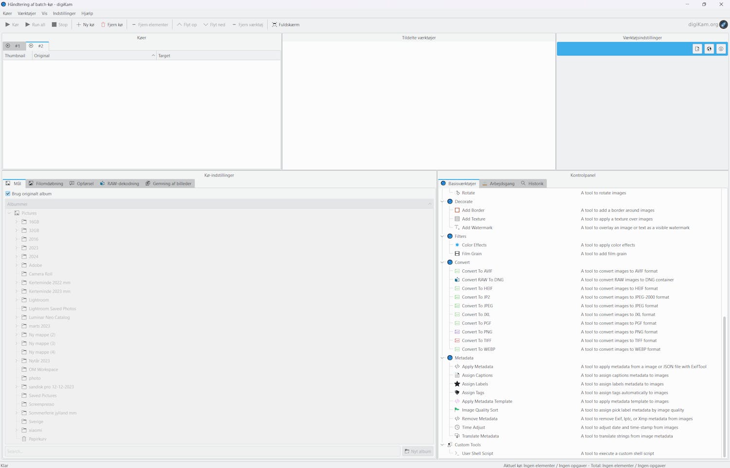 Når du klikker på Batch Queue Manager åbner et vindue, hvor du kan redigere store grupper af filer. Her kan du omdøbe dem for at give dem relaterede filnavne, og du kan konvertere raw-filer og gemme dem i et udvalg af populære formater. Der er også mulighed for at redigere, forskønne og dekorere den valgte billedgruppe.