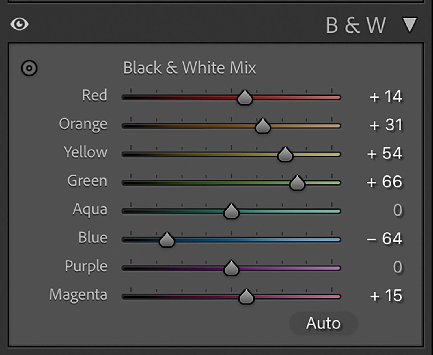I mange programmer kan du meget præcist bestemme, hvor mørke eller lyse de enkelte farver gengives i gråtoner. På den måde kan du fremhæve eller dæmpe bestemte ting i billedet. Det gælder også, selv om du har valgt en profil med et farvefilter, som vi viste i tip 2. Justeringerne foretages typisk i et selvstændigt panel til farvejustering eller justering af sort-hvid.
