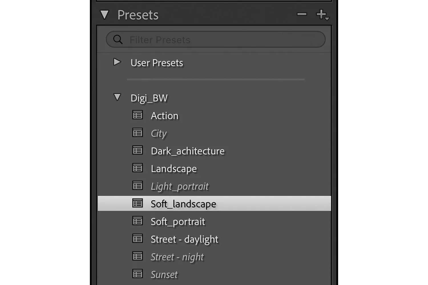 Når du har lavet en god sort-hvid justering, kan du i mange programmer gemme justeringerne som en forindstilling, ofte kaldet et preset, som du kan bruge igen og igen på andre billeder. Du opretter dem typisk i et panel, der hedder Presets eller Develop Presets, hvor du kan klikke for at gemme de indstillinger, du har brugt. Mange programmer har desuden en række indbyggede forindstillinger til sort-hvide fotos, som du kan bruge. Du kan også importere andres forindstillinger. Vi har fx lavet en pakke med ti sort-hvide presets til Lightroom.