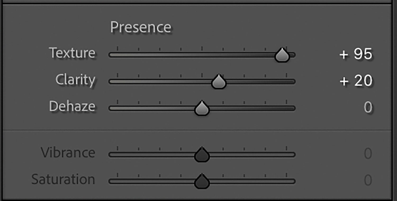 Mange programmer har justeringer, der kan fremhæve strukturer, hvilket fungerer godt til sort-hvid. De kan hedde Structure, Clarity eller Texture, og nogle programmer har flere forskellige. Zoom ind i billedet, og hold godt øje med effekten, når du justerer på skydeknapperne.