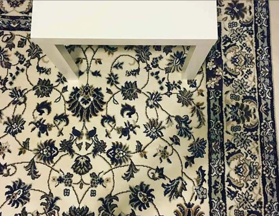 Telefonen på gulvtæppet blev en en 2016-klassiker. Find mobiltelefonen. Hint: Kig ved siden af det højre bordben i den store stribe.