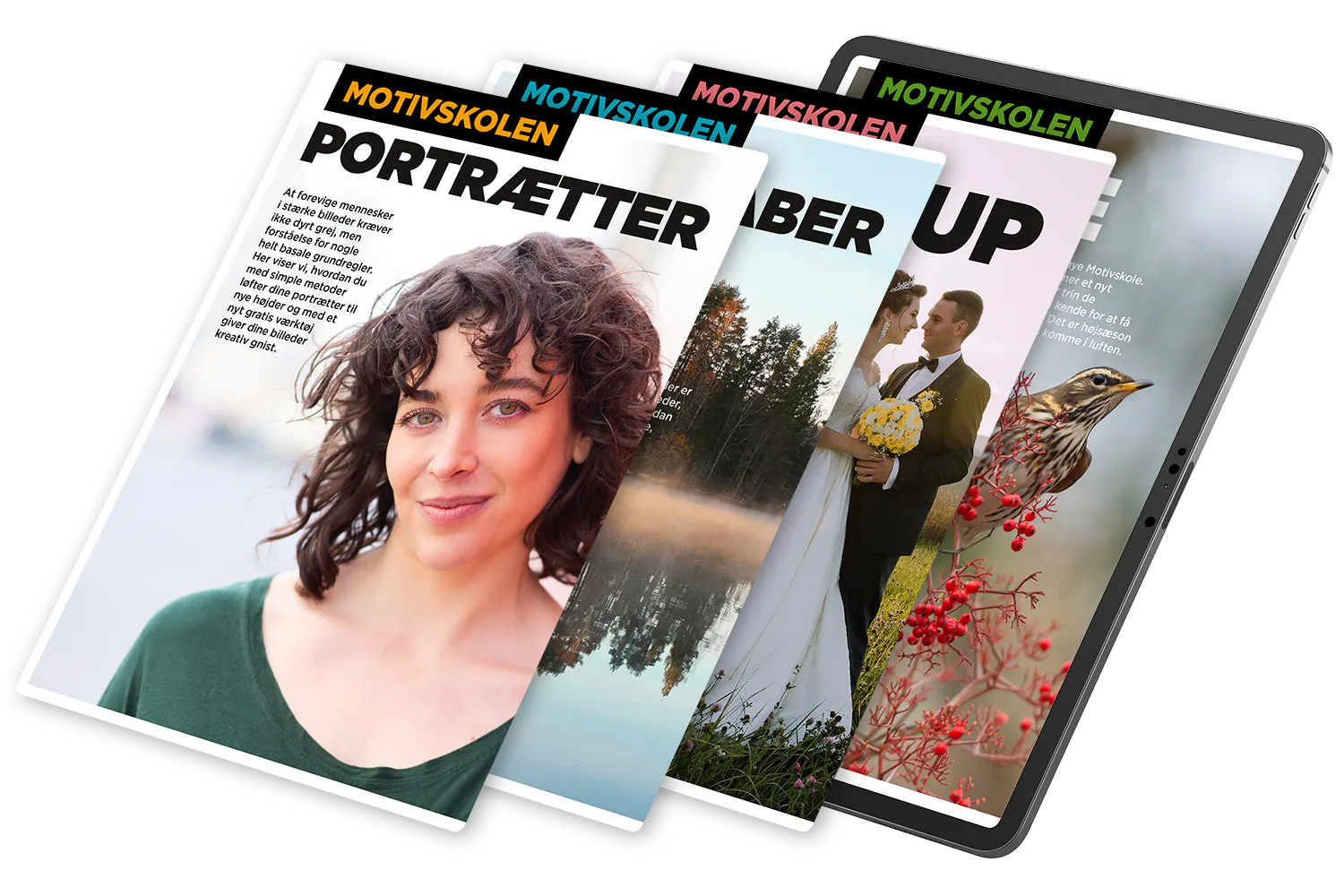 Nu kan du hente de første fire afsnit af vores serie “Motivskolen", hvor du lærer alt det grundlæggende for at tage billeder af alle de store motiver. Hvert afsnit er en lille e-bog, som du kan gemme på digitale enheder og tage med dig.