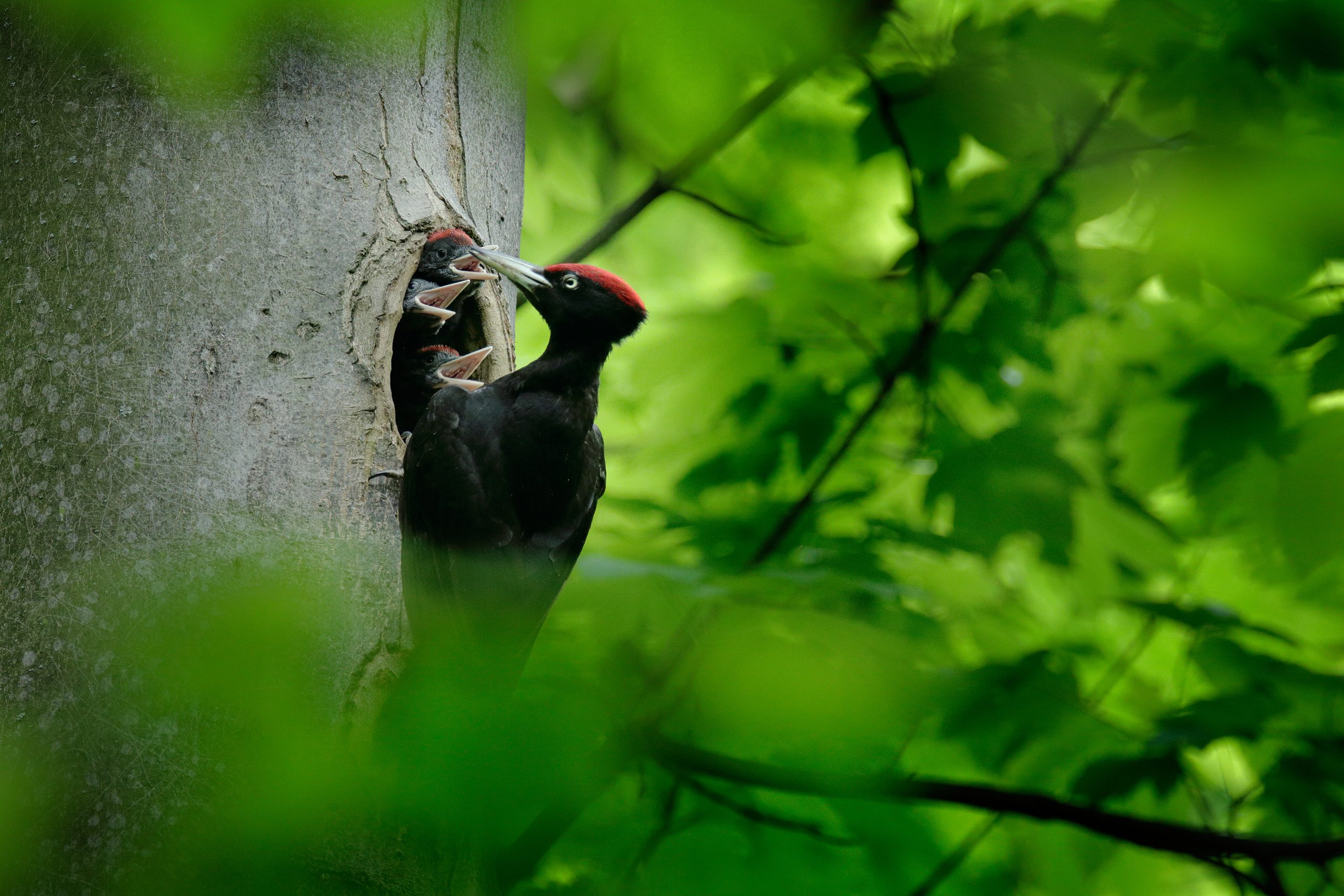 Slutningen af maj: Den karakteristiske sortspættes unger er udklækket, og finder du redehullet, kan du få et billede af de ivrige ungers næb, der stikker ud af redehullet under fodringen.