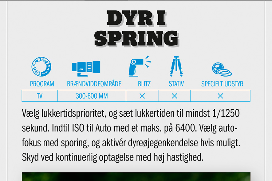 Med motivkort får du anvisninger til konkrete motiver, så du ved, hvilket grej du skal bruge, og hvordan du griber opgaven an. Her kan du hente motivkort til dyrefotos.