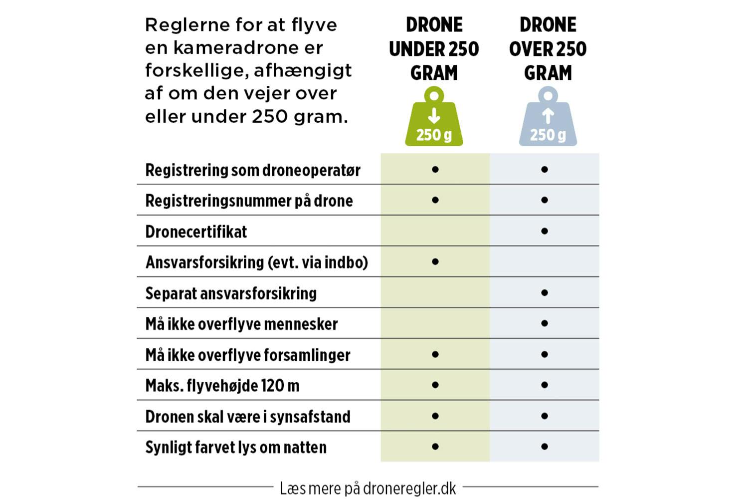 Vejer dronen under 250 gram, kan den være dækket af din indboforsikring. Vejer den 250 gram eller mere, skal du have en separat forsikring til den. I det hele taget er 250 gram en vigtig skillelinje. Reglerne er lidt strammere, hvis din drone vejer mere end det. Så er det et krav, at du tager et dronecertifikat, og der er desuden andre regler for, hvor du må flyve, men det er ikke så skræmmende, som det lyder. Som udgangspunkt må du ikke flyve hen over mennesker med en drone, der vejer mere end 250 gram. Du skal holde 30 meters afstand til personer. Vejer dronen under 250 gram, må du gerne flyve over mennesker, dog ikke større forsamlinger.