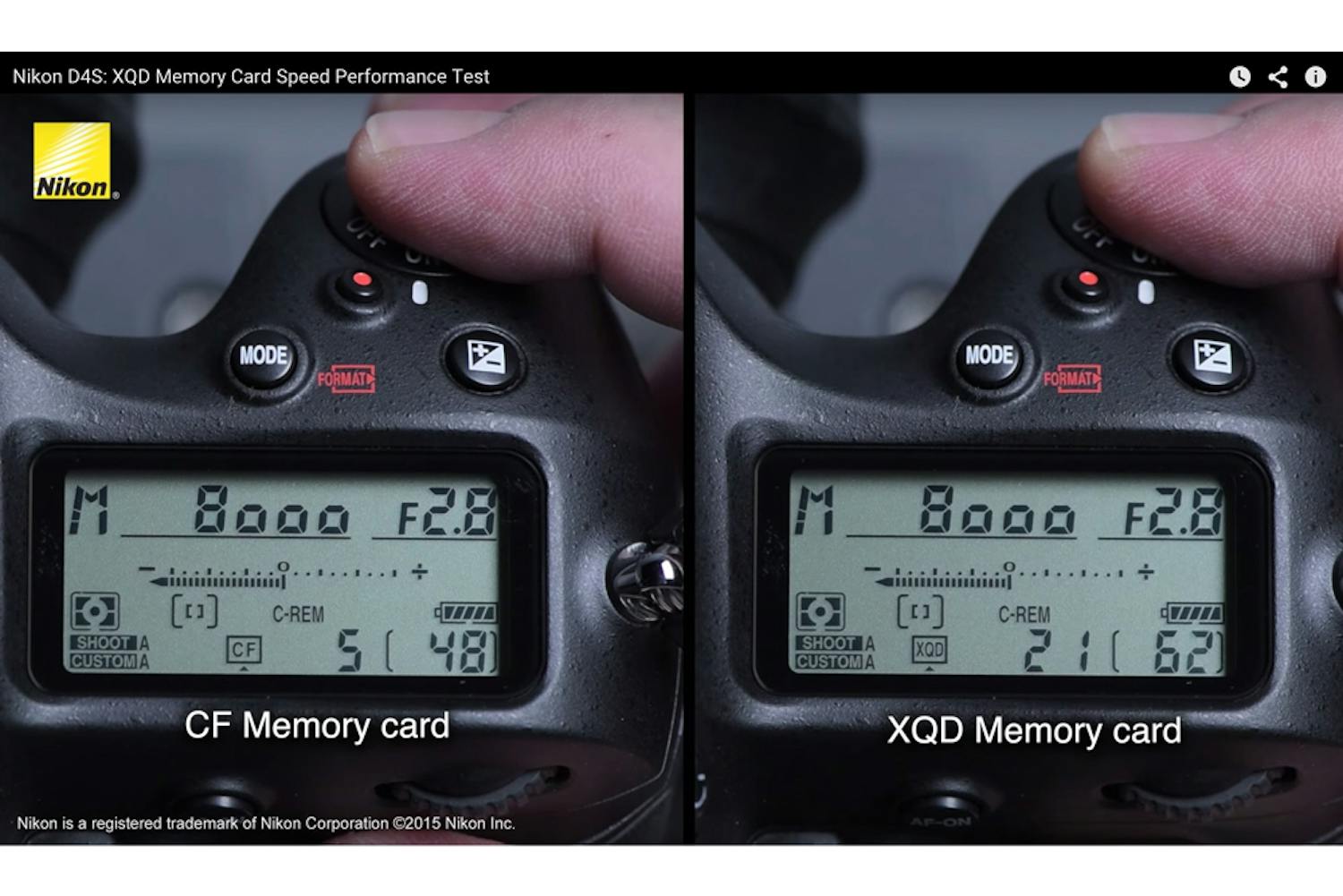 Et hurtigt kort kan gøre forskellen på, om man får pletskuddet med hjem eller ej. Nikon Asia har lavet en video, hvor de skyder med henholdsvis et hurtigt CF-kort og et XQD-kort i et D4S-kamera, og forskellen er markant.