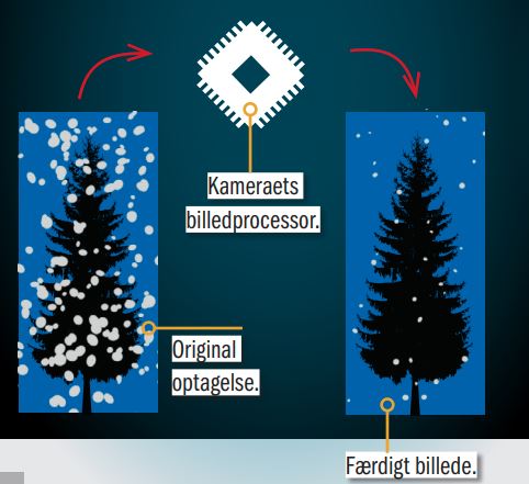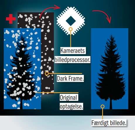 Efter eksponeringen tager kameraet endnu en eksponering uden at åbne lukkeren. Billede nummer to er helt sort. Det bruger processoren til at registrere den støj, der dannes i sensoren. Den billedstøj, der registreres, trækker processoren ud af det rigtige foto. Derefter støjreduceres optagelsen normalt, og resultatet er et markant renere billede.