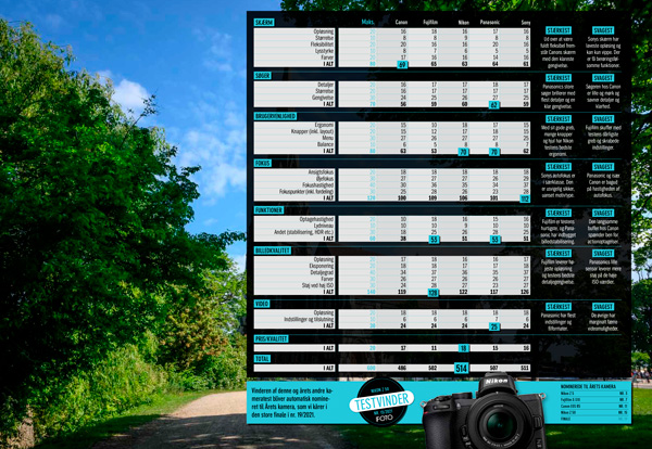 Det andet er Nikon Z 50, der placerer sig flot igennem pointskalaen uden dog at være allerbedst i nogle af dem – bortset fra prisen. Men det afspejler egentlig bare, at Nikon Z 50 er et meget helstøbt kamera, der præsterer godt på alle tangenter til en virkelig god pris. Derfor ender Nikon Z 50 som testvinder. Havde Sony prioriteret skærmkvalitet og ergonomi højere, havde kameraet taget prisen. Set på billedkvalitet alene lægger Fujifilm sig marginalt foran Sony, men Fujifilm taber terræn på flere væsentlige punkter, og så er det tilmed dyrest. Canon har svært ved at følge med i de fleste discipliner, men udmærker sig ved en rigtig god skærm og testens laveste pris.
